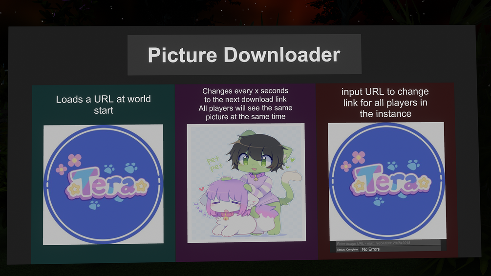 - load a series of pictures from a list of urls. You can choose how fast (in seconds) the next url will load. Late join synced. All users in the instance will see the same picture at the same time.